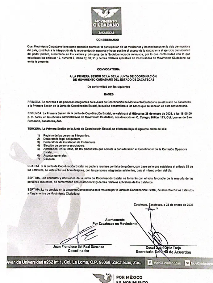 A LA PRIMERA SESIÓN DE LA DE LA JUNTA DE COORDINACIÓN DE MOVIMIENTO CIUDADANO DEL ESTADO DE ZACATECAS